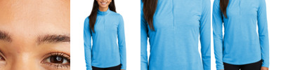 92% polyester/8% spandex wicking pinhole mesh * Wicks Moisture * Ladies' fit * Tag-free label * V-neck collar * Contrast color inserts and piping
