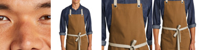 8.5-ounce, 100% cotton canvas Contrast 100% cotton webbing neck and waist ties Antique brass metal grommets and neck adjuster Two patch pockets with antique brass metal rivets 21.25'w x 30.25'l