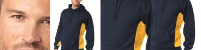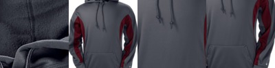 100% polyester fleece moisture management fabric • front and back contrast inserts with piping • front pouch pocket with two self-adhesive closure top pockets • poly rib cuffs and waistband • embroidered logo on left sleeve • Sizes: XS-4XL