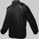 93% Polyester/7% Spandex • Water and wind resistant • Contrast shoulder inserts on front, back and top of sleeve ends • 7" Locking zipper front with spandex reinforced rib knit back neck collar • 9" Zipper on right side seam for easy on/off • Open bottom with bungee cord and hidden toggles on left side seams • Contrast sleeve hem • Embroidered Badger logo on left sleeve • Sizes: XS-4XL