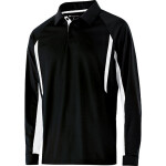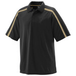 94% polyester/6% spandex knit * 100% polyester pinhole micromesh inserts * Odor-resistant * Wicks moisture away from the body * Heat sealed label * Self-fabric collar * Breathable contrast-color pinhole mesh front and back shoulder inserts * Topstitched armholes * Individually polybagged * Set-in sleeves * Three matching buttons with cross-stitching * Box-stitched placket * Double-needle hemmed sleeves and bottom